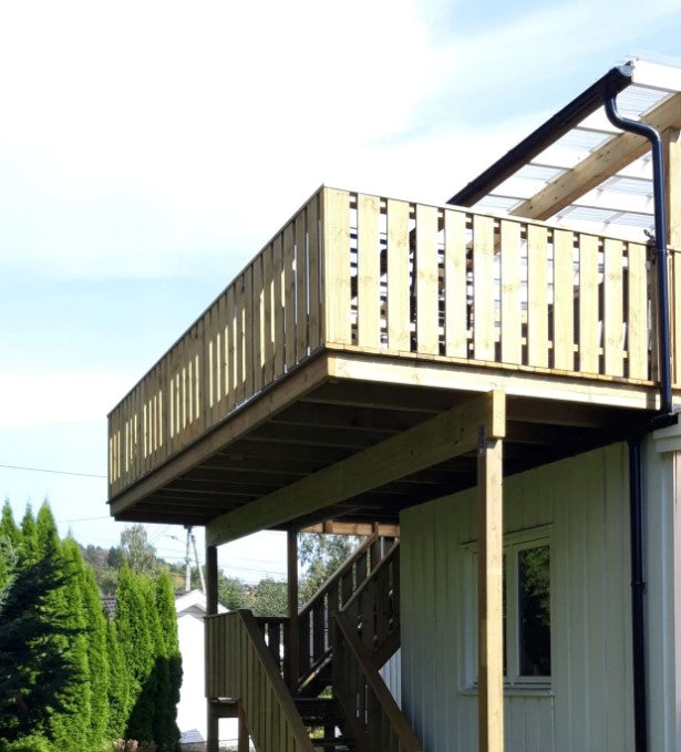 Bygging av veranda med trykkimpregnert furutre, veranda med en størrelse over 20 m2. Vi bruker 48x148 trykkimpregnert furutre for konstruksjonen. Verandaen skal plasseres på trestolper. Rekkverk, tætning eller trapp kommer som ekstra kostnader. Prisen er per 1 m2 av veranda, og prisen er oppgitt uten MVA. Det må legges til 25% mva i tillegg. Ring eller skriv til oss for å bestille en gratis befaring for veranda. Tel: 46376577